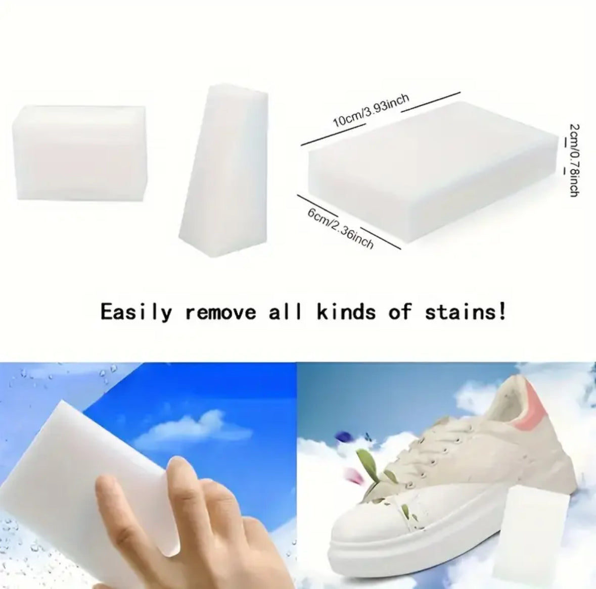 Keep your home spotless with our Magic Cleaning Sponge Eraser Pads! Made from premium polyurethane foam, these sponges effectively remove tough stains, dirt, and marks without using any chemicals or detergents. Simply add water and wipe — it’s that easy! Perfect for use in the kitchen, bathroom, bedroom, and living areas. Safe on most surfaces including walls, floors, sinks, glass, furniture, and bathtubs.