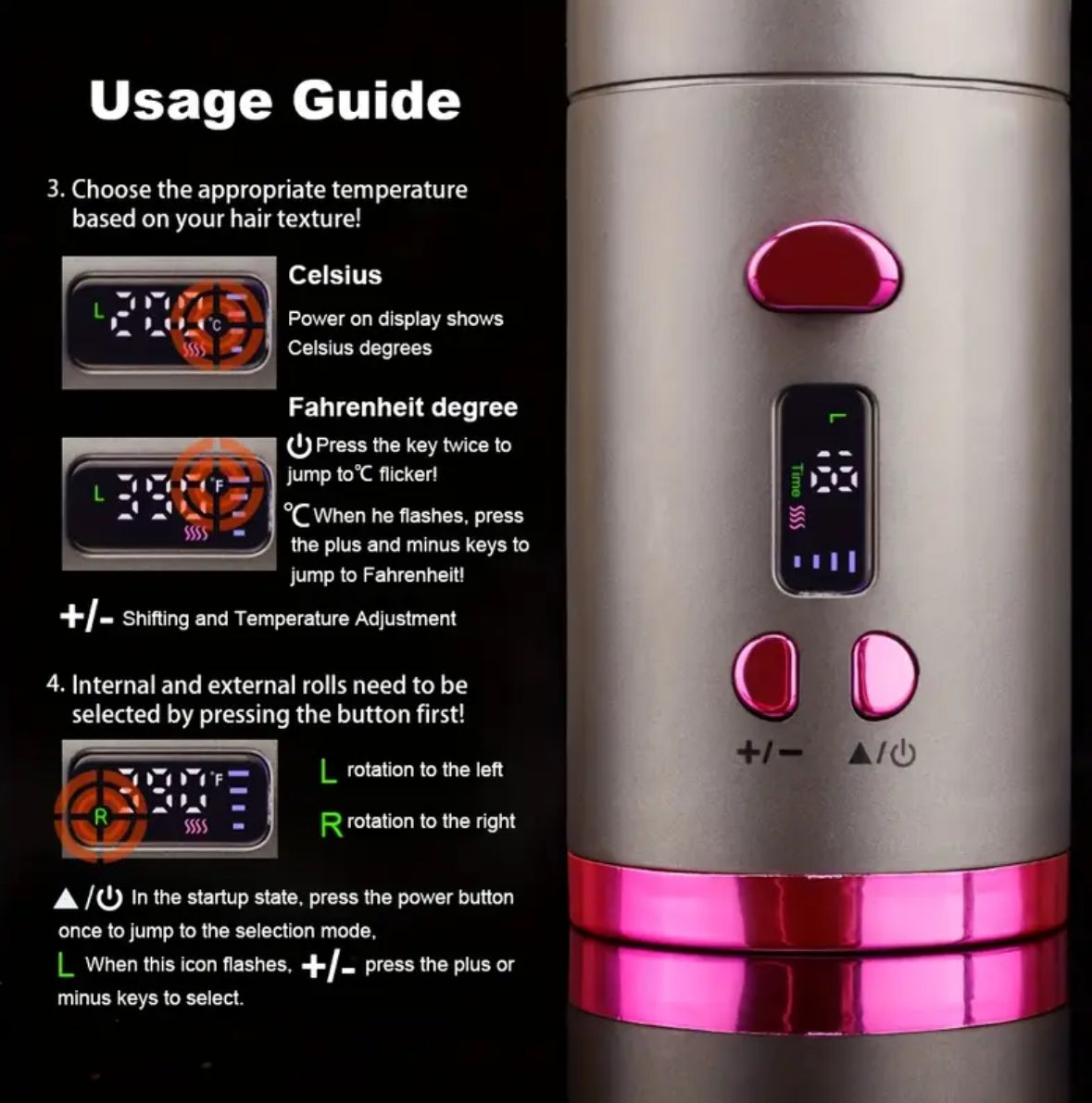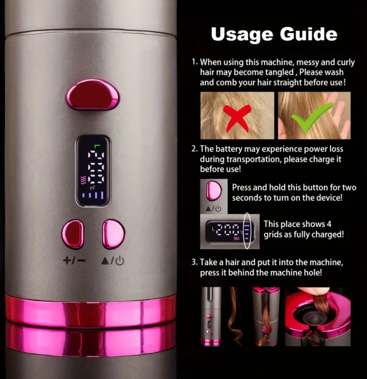 Achieve salon-quality curls at home with this Rechargeable USB Automatic Curling Iron. Designed for effortless styling, it features left and right rotation and adjustable speeds, allowing you to create perfect curls or waves in minutes. With 5 temperature settings, it works on all hair types—whether fine, medium, or thick—while the wireless USB rechargeable design ensures you can style anywhere, anytime. Compact, safe, and easy to use, this curling iron is your go-to tool for beautiful, long-lasting curls without the hassle of cords or complicated techniques.